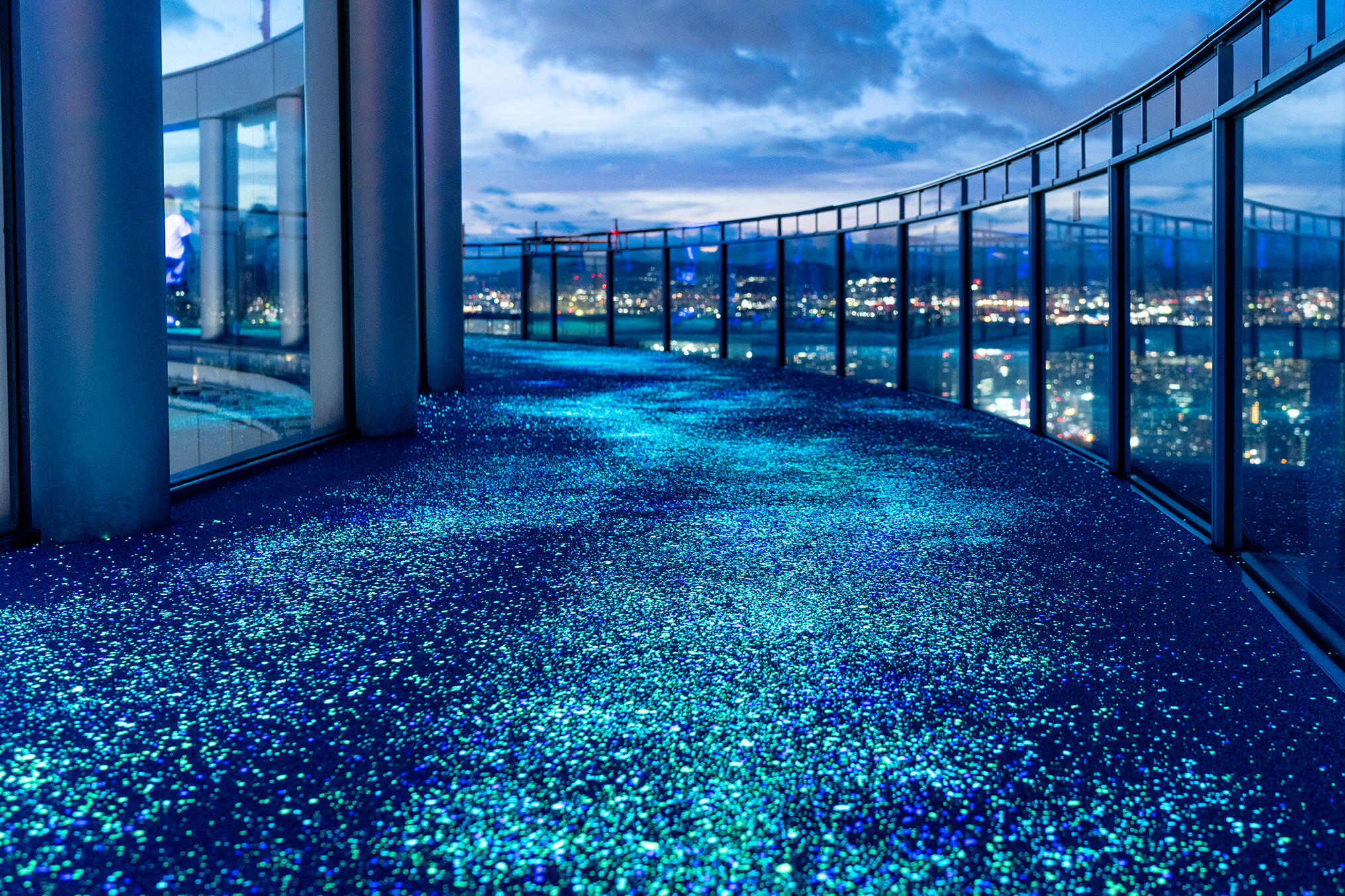 移り行く大阪平野を、360度オープンエアで見続けられる空中庭園展望台があります。展望台までの道中もシースルーなど、心躍る体験ができます。