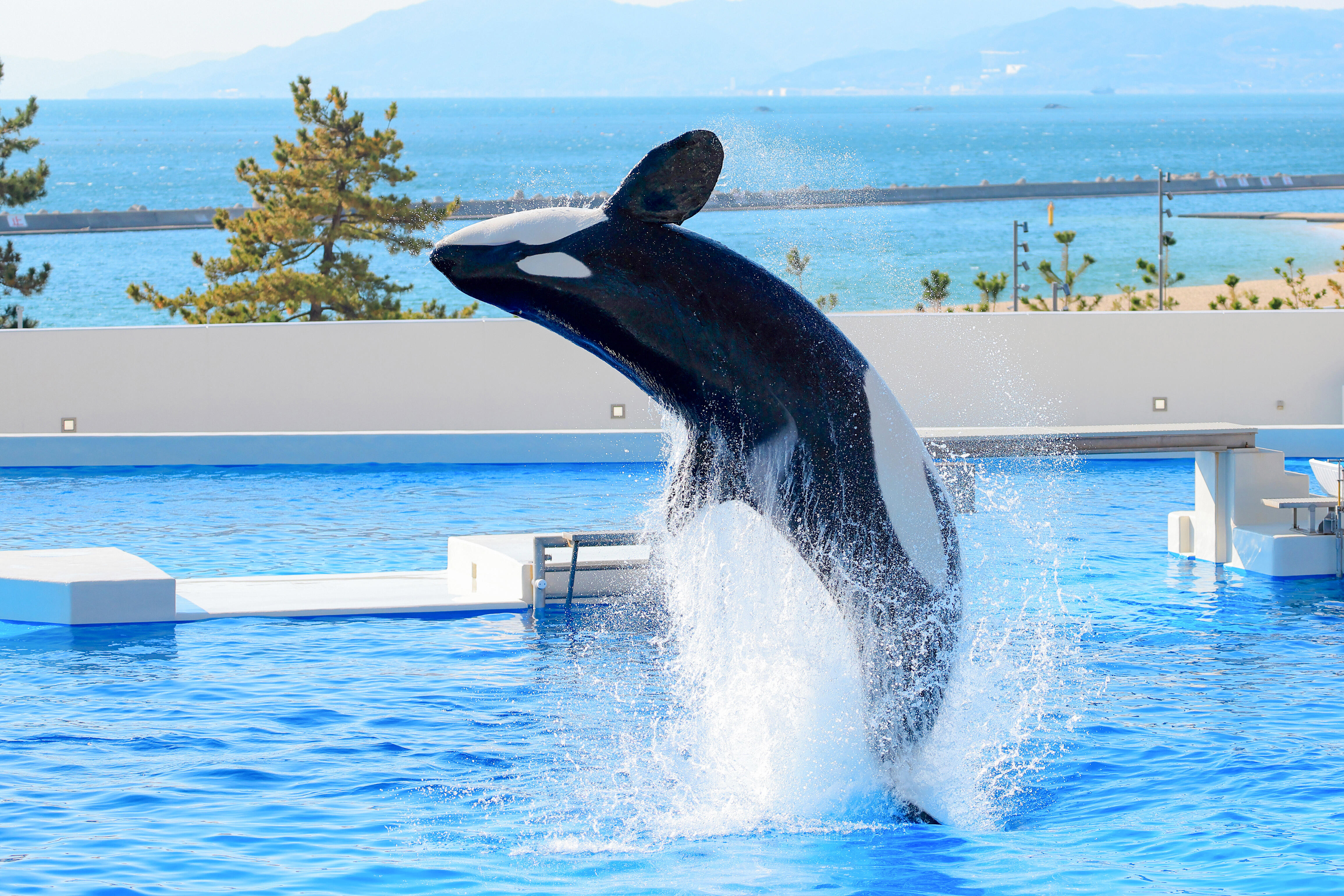 オルカスタディアム、ドルフィンスタディアム、 アクアライブの3つの建物で構成され、施設内に560種1万9000点もの生きものを展示。シャチが目の前で泳ぐレストランも!