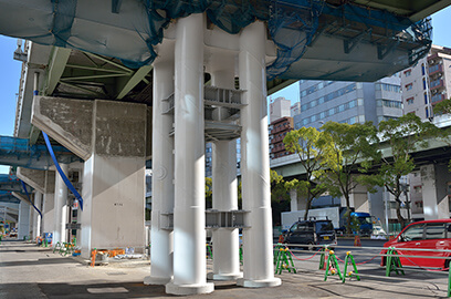 さらに、新しくつくる橋脚は街路の本線と側道の分離帯に設置されるので、見通しを出来るだけ妨げないことも交通安全の観点から重要でした。鋼管4本で構成される鋼管集成橋脚は、見通しの良さという点でも優れた橋脚と言えると思います。