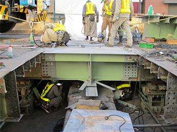 ある路線または区間を短期間・集中的(概ね8昼夜間連続)に通行止めを行うことで、安全かつ効率的に補修する工事手法で、阪神高速では1973年より実施しています。短期間に数多くの工事を実施できるため、通常の車線規制工事と比較し、交通影響や工事費の面で優れています。さらに、工事の施工性がよいことから、品質管理や安全面でも優れています。