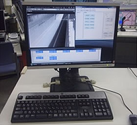 センサで歩行者や自転車、逆走車を検知すると、現地に設置された写真-4に示す表示板と写真-3に示す拡声装置で事前に登録された表示内容と固定メッセージにより自動的に警告を行うとともに、交通管制室にも警報があがり、写真-5に示す交通指令台に設置している監視卓のモニタにより、遠赤外線カメラの映像で現地の状況を確認できるシステムとなっています。また、状況に応じて表示内容と固定メッセージを交通管制室から手動で変更することも可能です。