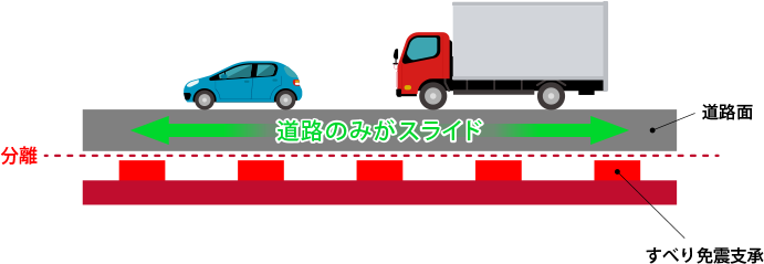 なお、床組が全く固定されていないと、地震が起きてスライドした際に動いたままになってしまうため、動いた床組を元の位置に戻すため、積層ゴム支承という部材を併設しています。