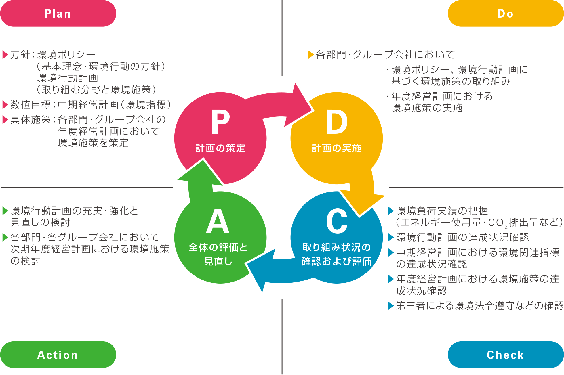「サステナビリティ推進委員会」の傘下に「環境行動推進委員会」を設置し、環境行動計画の進捗管理、CO2排出量など環境負荷実績の把握、地球環境保全に関する戦略や方針の策定等環境マネジメントを推進しています。また、重要事項については、サステナビリティ推進委員会に報告しています。