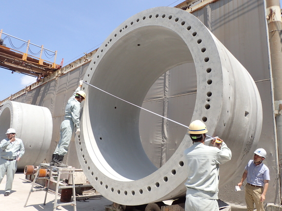圧入式オープンケーソン工法(PCウェル工法)により、円筒形のコンクリートブロックを地中に押し込んで、橋脚基礎の構築を進めています。