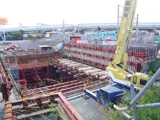最終的に線路の下へ押し込むことになるトンネル本体を造るためのスペース(立坑)を構築するため、地面と壁にコンクリートを入れました。