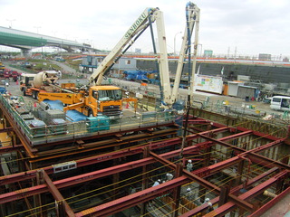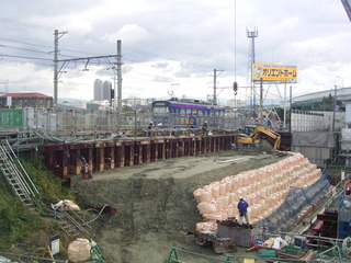 最終的に線路の下へ押し込むことになるトンネル本体を造るためのスペース(立坑)を構築するため、地面を掘っています。