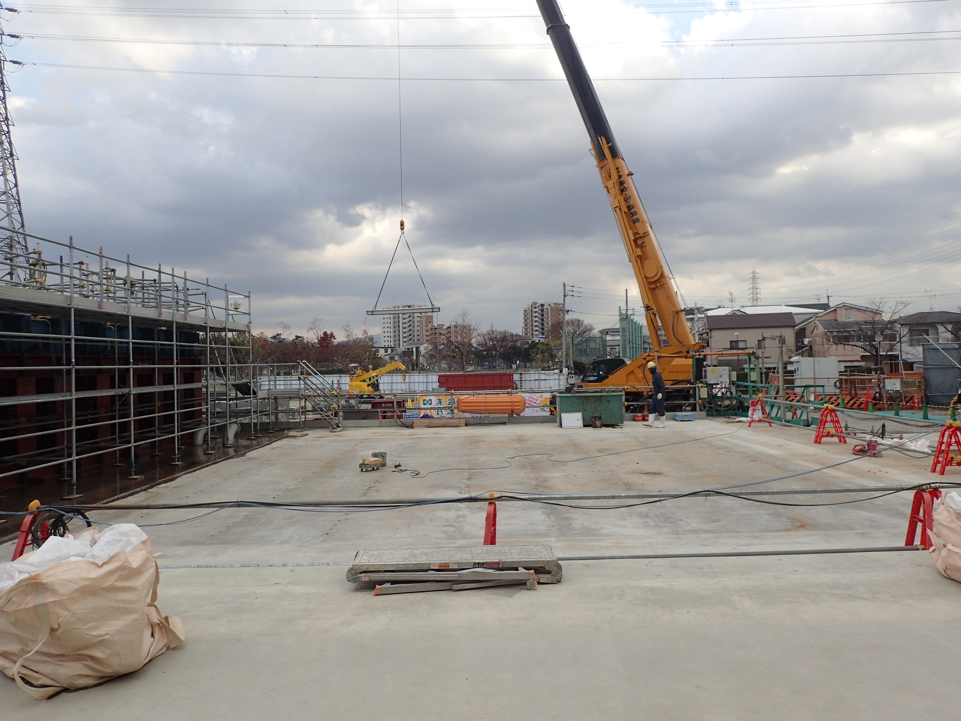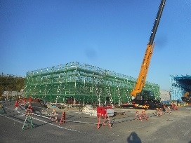 避難通路設備のすべり台設置を開始しました。