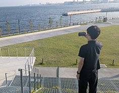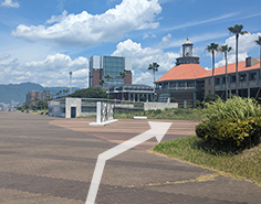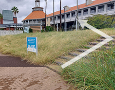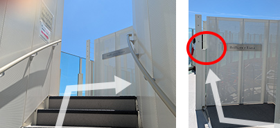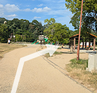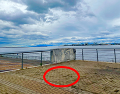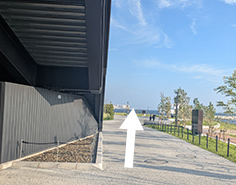 AR体験の目印は、案内板と足元シールです。それぞれの場所の景色や雰囲気に合わせてデザインされているので、ぜひ探してみてください!この目印を見つけたら、ARアプリを起動して、未来の風景を体験しましょう。