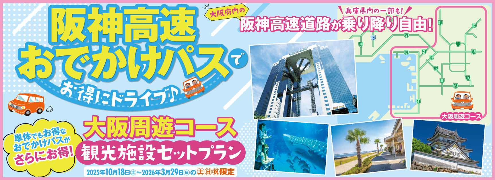 本商品は、お客さまが事前にお申し込みされた日及び車種について、対象区間内の阪神高速道路の通行料金が1日定額となる「阪神高速おでかけパス」と「観光施設入場券」を一緒に購入することで、おでかけパスが1,450円でお申込みいただけます。