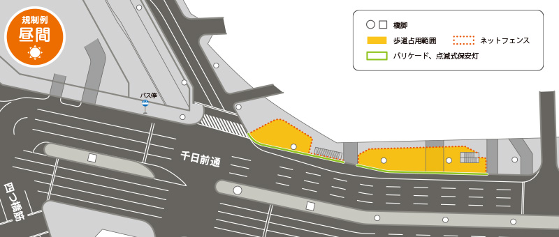 15号堺線 湊町付近におきまして、橋脚の鋼製基礎大規模更新工事を実施しており、街路の千日前通(東行)にて下記のとおり昼間および夜間の交通規制を行います。