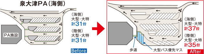 また、大型バス優先マスを駐車場外縁部に配置し、車道を横断することなくPA施設を安全に利用いただけるようになります。